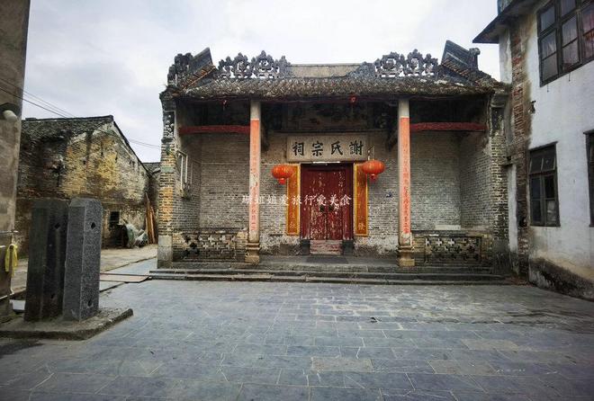 宗祠坐东南朝西北,是典型的二进一井带两廊格局,第二进的地面比第一进略高,寓意“步步高升”。整个建筑通面阔9.8米,进深18.2米,建筑面积178平方米,虽然不算宏大,但布局规整,透着岭南建筑的精巧。宗祠前的青石地坪上,立着两通旗杆石,上面阴刻着“道光二十一年、光绪十五年、光绪二十年岁进士候铨儒学训导谢玉楷、谢草芳、谢岩阿立”的字样,这些文字是研究当地谢姓族人历史的珍贵实物资料。走进宗祠,木质的梁柱、雕花的窗棂都保存完好,阳光透过天井洒进来,照亮了地上的青苔,仿佛能看到当年族人祭祀时的庄重场景。