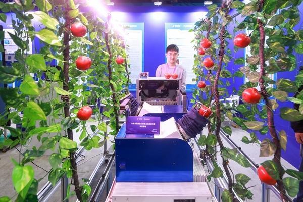 2025年3月28日,作为2025中关村论坛年会的重要组成部分,中关村国际技术交易大会“全球高校科技成果转化促进大会”在北京工业大学开幕。北工大科研团队带来的番茄智能交互采摘机器人进行自动采摘演示。视觉中国供图