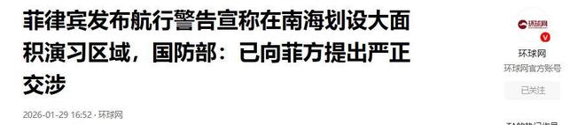 参考资料:菲律宾发布航行警告宣称在南海划设大面积演习区域,国防部:已向菲方提出严正交涉2026-01-29 16:52·环球网